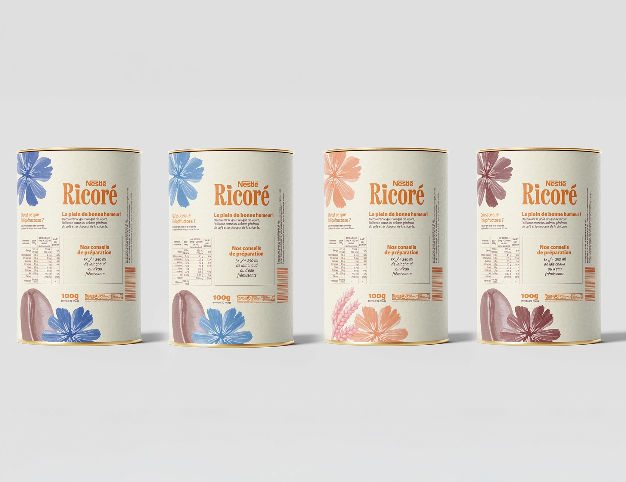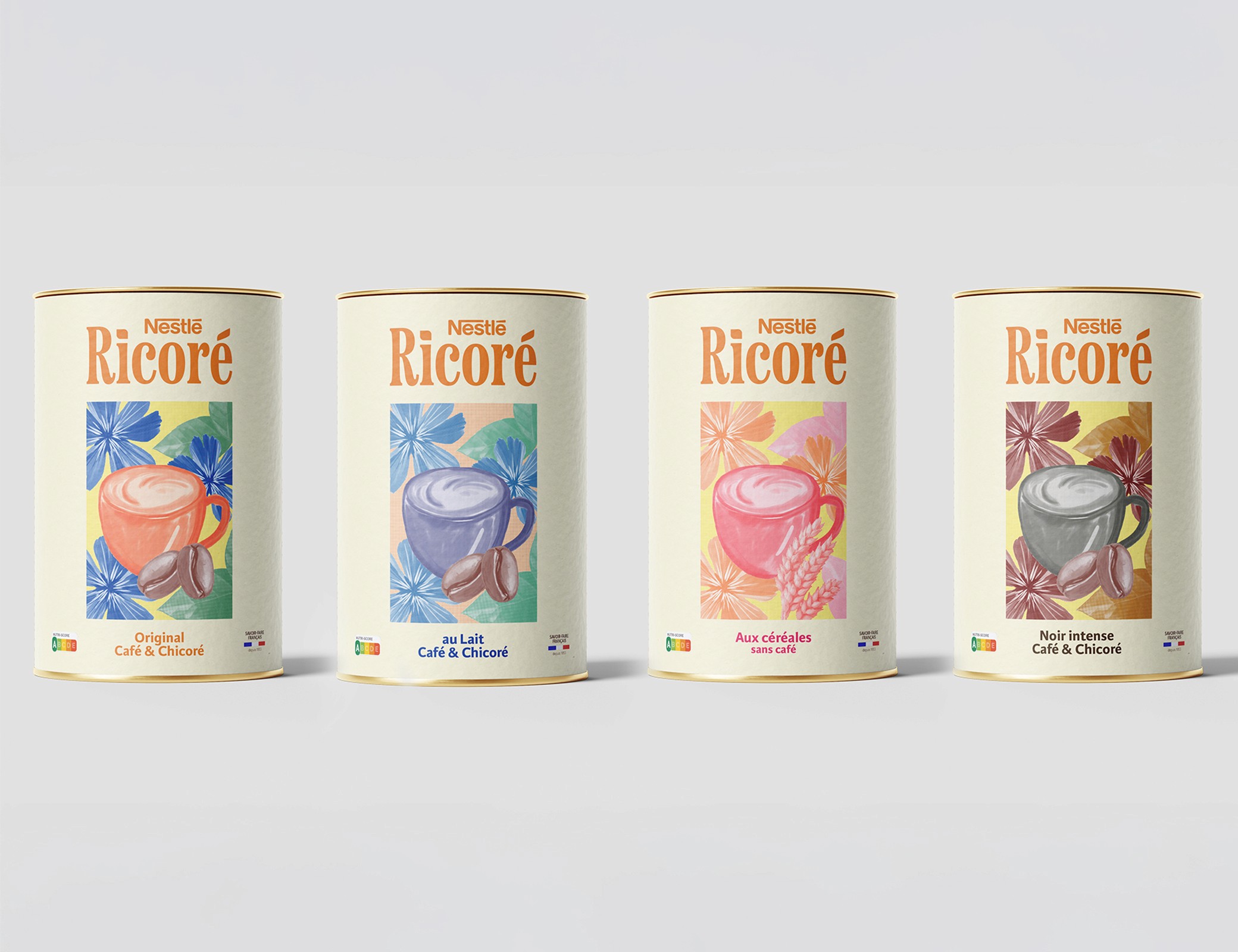 Projet d’école réalisé en autonomie, ce travail sur Ricoré m’a offert une totale liberté stratégique et créative. Après une analyse approfondie du marché, de la marque et de ses concurrents, j’ai conclu que pour toucher un public plus jeune, Ricoré devait moderniser son image. Cela m’a conduit à repenser entièrement son identité visuelle ainsi que le design du packaging.