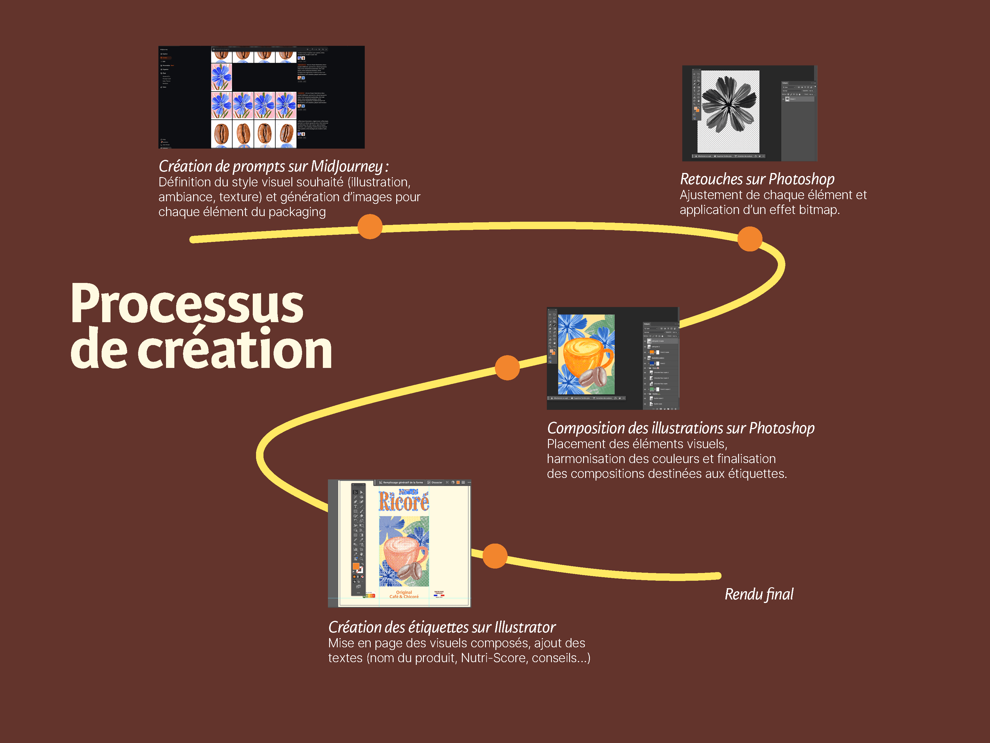 J’avais en tête une direction artistique très claire : un univers solaire, chaleureux, avec des illustrations fortes et texturées. Midjourney m’a servi d’assistant visuel. Je lui décrivais précisément ce que j’imaginais, en m’appuyant sur des références et des exemples. L’IA me proposait des pistes que je sélectionnais, ajustais, puis retravaillais entièrement sur Photoshop : correction des détails, ajout de textures, effets bitmap… Une fois les illustrations prêtes, je les ai composées et finalisées sur Illustrator, pour créer une identité visuelle cohérente et un packaging qui traduit exactement ce que j’avais en tête.